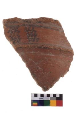 | Description / विवरण | A fragment of a potsherd. It is reddish in colour with black decorative geometric painting on it. |