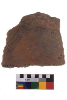 | Description / विवरण | A fragment of a potsherd. It is reddish in colour with black decorative geometric painting on it. |