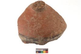 | Description / विवरण | Specimen of black on red ware with black decorative Lattice pattern geometric painting. |