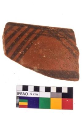 | Description / विवरण | Specimen of potsherd black on red painted pottery. It is fine fabric in sharp contrast with painted design are executed in black pigment. |