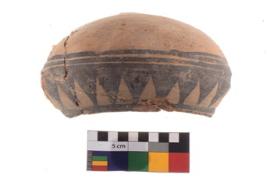 | Description / विवरण | A fragment of a potsherd. It is reddish in colour with black decorative geometric painting on it. |