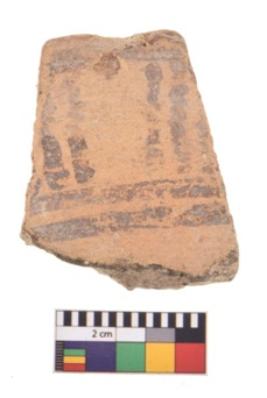 | Description / विवरण | A specimen of a potsherd. It is reddish in colour with black decorative geometric painting on it. |