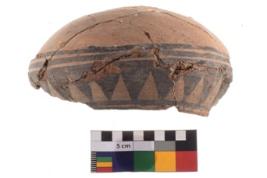 | Description / विवरण | A fragment of a potsherd. It is reddish in colour with black decorative geometric painting on it. |