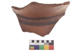 | Description / विवरण | Specimen of black on red ware with decorative geometric Vertical strokes set in two horizontal bands painting. |
