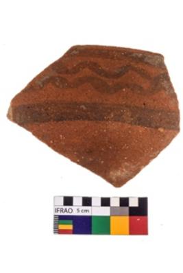 | Description / विवरण | Specimen of potsherd black on red painted pottery. It is fine fabric in sharp contrast with painted design are executed in black pigment. |