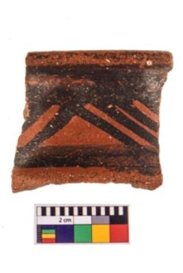 | Description / विवरण | Specimen of potsherd black on red painted pottery. It is fine fabric in sharp contrast with painted design are executed in black pigment. |