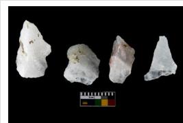 | Description / विवरण | Specimen of cores with weathered cortex and several broad fluted marks. Some of them are irregular in shape, whereas some are tapering at one end. |