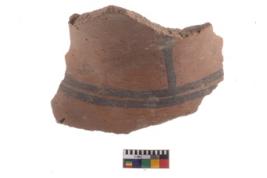 | Description / विवरण | A fragment of a potsherd. It is reddish in colour with black decorative geometric painting on it. |