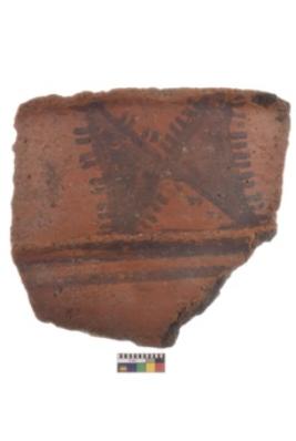 | Description / विवरण | Specimen of black on red ware with decorative geometric HorizontaL solid double axe pattern with shrot strokes all alnog the periphery painting. |