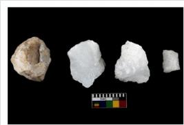 | Description / विवरण | Specimen of cores with weathered cortex and several broad fluted marks. Some of them are irregular in shape, whereas some are tapering at one end. |