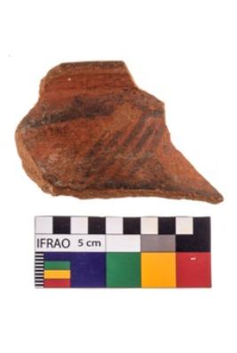 | Description / विवरण | Specimen of potsherd black on red painted pottery. It is fine fabric in sharp contrast with painted design are executed in black pigment. |