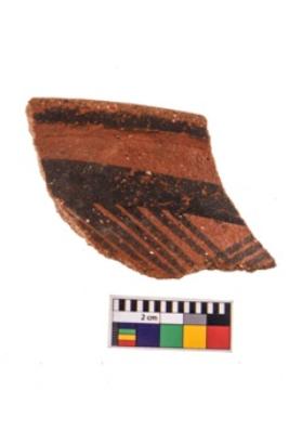 | Description / विवरण | Specimen of potsherd black on red painted pottery. It is fine fabric in sharp contrast with painted design are executed in black pigment. |