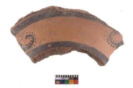 | Description / विवरण | A fragment of a potsherd. It is reddish in colour with black decorative geometric painting on it. |