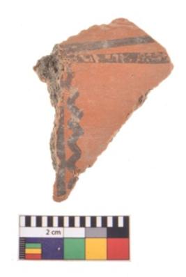 | Description / विवरण | A specimen of a potsherd. It is reddish in colour with black decorative geometric painting on it. |