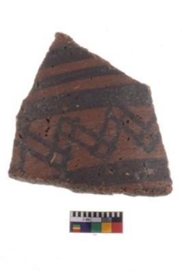 | Description / विवरण | A fragment of a potsherd. It is reddish in colour with black decorative geometric painting on it. |
