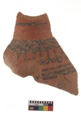 | Description / विवरण | Specimen of black on red ware with black decorative Parallel lines with round edges geometric painting. |