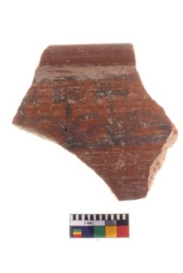 | Description / विवरण | A fragment of a potsherd. It is reddish in colour with black decorative geometric painting on it. |