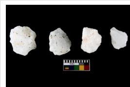 | Description / विवरण | Specimen of cores with weathered cortex and several broad fluted marks. Some of them are irregular in shape, whereas some are tapering at one end. |