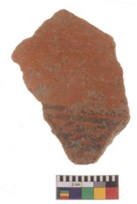 | Description / विवरण | Specimen of black on red ware with black decorative Lattice pattern geometric painting. |