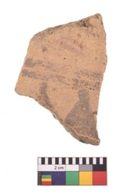 | Description / विवरण | A specimen of a potsherd. It is reddish in colour with black decorative geometric painting on it. |