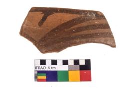 | Description / विवरण | Specimen of potsherd decorated with two horizontal bands, one on the rim and other on the body, while between them are set of triple aches. |