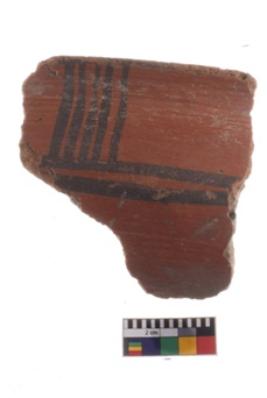 | Description / विवरण | A fragment of a potsherd. It is reddish in colour with black decorative geometric painting on it. |
