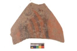 | Description / विवरण | Specimen of black on red ware with black decorative Curved lines geometric painting. |