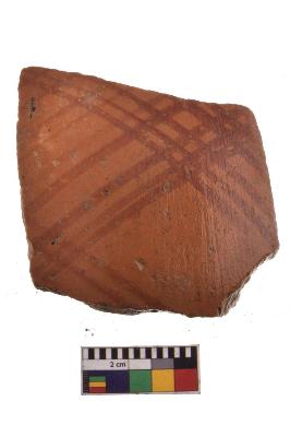 | Description / विवरण | Specimen of red on red ware with decorative geometric A latticed diamonds with criss-cross pattern painting. |