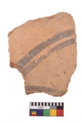 | Description / विवरण | A specimen of a potsherd. It is reddish in colour with black decorative geometric painting on it. |