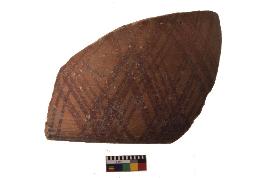 | Description / विवरण | Specimen of red on red ware with decorative geometric A latticed diamonds with criss-cross pattern painting. |