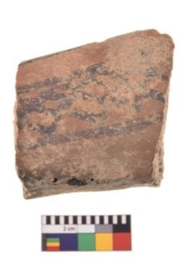 | Description / विवरण | A specimen of a potsherd. It is reddish in colour with black decorative geometric painting on it. |