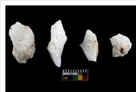 | Description / विवरण | Specimen of cores with weathered cortex and several broad fluted marks. Some of them are irregular in shape, whereas some are tapering at one end. |