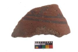 | Description / विवरण | A fragment of a potsherd. It is reddish in colour with black decorative geometric painting on it. |