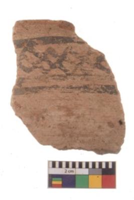 | Description / विवरण | Specimen of black on red ware with black decorative Lattice pattern geometric painting. |