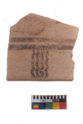 | Description / विवरण | A fragment of a potsherd. It is reddish in colour with black decorative geometric painting on it. |