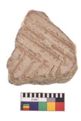 | Description / विवरण | A specimen of a potsherd. It is reddish in colour with decorative engraved painting on it. |