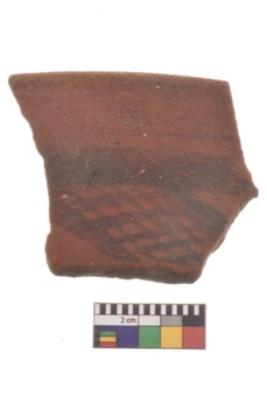| Description / विवरण | Specimen of black on red ware with decorative geometric Two horizontal bands containing criss-cross pattern painting. |