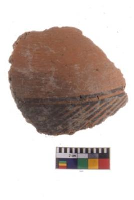 | Description / विवरण | A fragment of a potsherd. It is reddish in colour with black decorative geometric painting on it. |