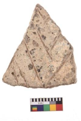 | Description / विवरण | A specimen of a potsherd. It is reddish in colour with black decorative geometric painting on it. |