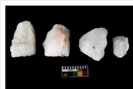 | Description / विवरण | Specimen of cores with weathered cortex and several broad fluted marks. Some of them are irregular in shape, whereas some are tapering at one end. |