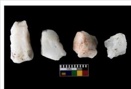 | Description / विवरण | Specimen of cores with weathered cortex and several broad fluted marks. Some of them are irregular in shape, whereas some are tapering at one end. |