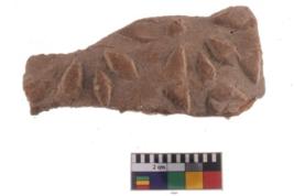 | Description / विवरण | A fragment of a potsherd. It is reddish in colour with stamped decorative nature painting on it. |