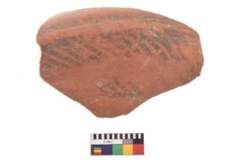 | Description / विवरण | A specimen of a potsherd. It is reddish in colour with black decorative geometric painting on it. |