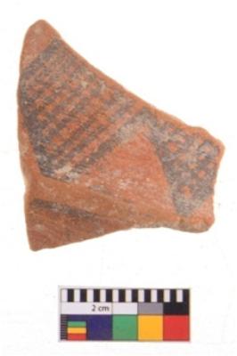 | Description / विवरण | Specimen of potsherd with decorative geometric painting. Type Black on Red ware |