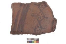 | Description / विवरण | Specimen of black on red ware with decorative geometric Horizontal row of connected diamonds filled in with dots and barbs at either end painting. |