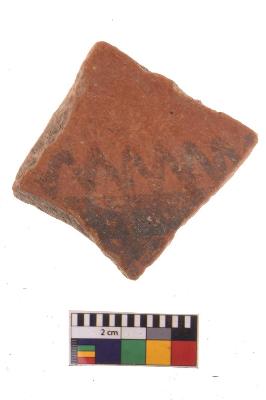 | Description / विवरण | Specimen of potsherd with black decorative geometric zigzag painting, Type Black on Red Ware . |