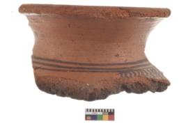 | Description / विवरण | Specimen of black on red ware with decorative geometric Three parallel horizontal lines and latticed bands painting. |