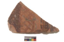 | Description / विवरण | Specimen of black on red ware with black decorative Lattice pattern geometric painting. |