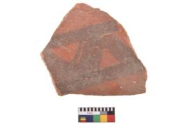 | Description / विवरण | A specimen of a potsherd. It is reddish in colour with black decorative geometric painting on it. |