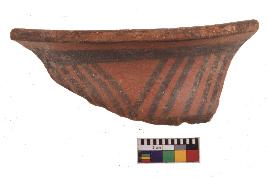 | Description / विवरण | Specimen of black on red ware with decorative geometric Groups of oblique strokes set in horizontal bands on the exterior painting. |